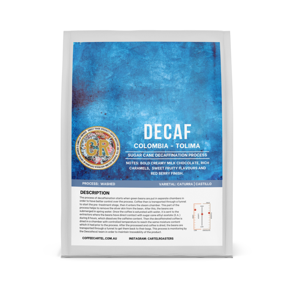 The process of decaffeination starts when green beans are put in separate chambers in order to have better control over the process. Coffee then is transported through a funnel to start the pre-treatment stage, then it enters the steam chamber. This part of the process helps to remove the silver skin from the bean. After this, the beans are submerged in spring water. Once the coffee is saturated with water, it is sent to the extractors where the beans have direct contact with sugar cane ethyl acetate (E.A.) during 8 hours, which dissolves the caffeine content. Then the decaffeinated coffee is dried in a chamber with controlled temperature to reach the same moisture content which it had prior to the process. After the processed and coffee is dried, the beans are transported through a funnel to get them back to their bags. This process is monitoring by the Descafecol team in order to maintain traceability of the product.