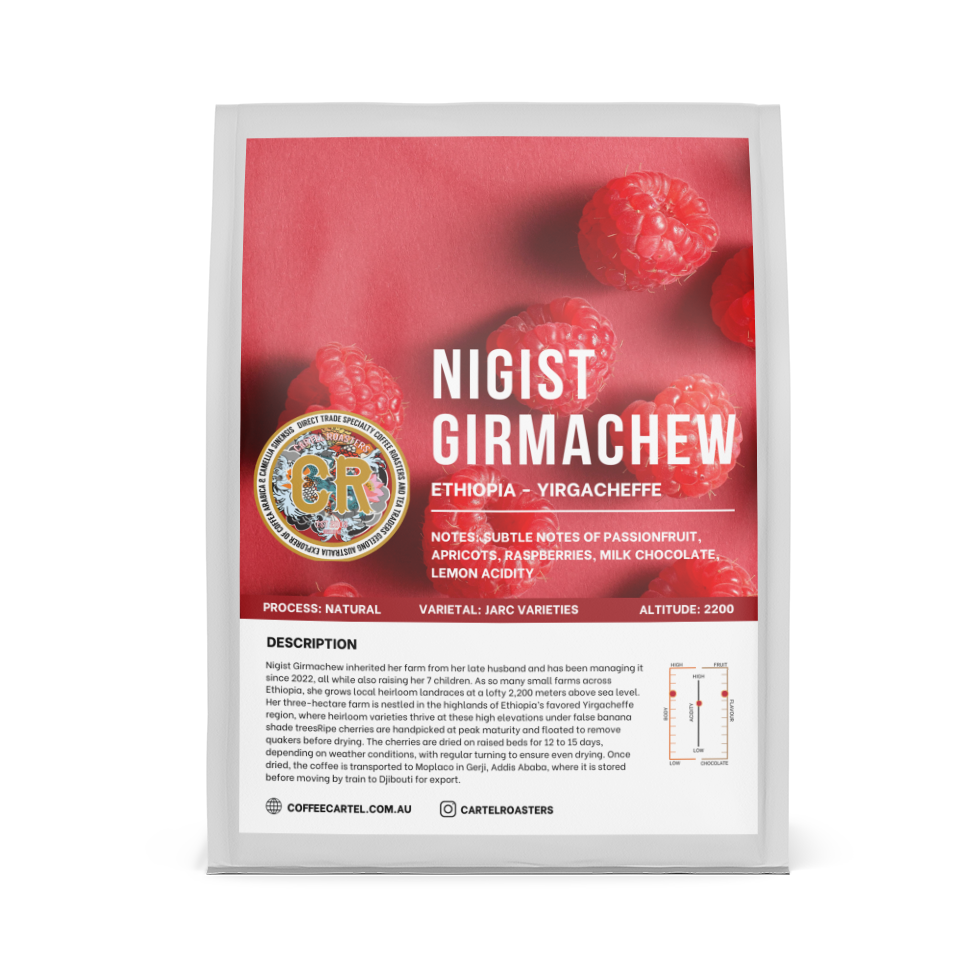 Nigist Girmachew inherited her farm from her late husband and has been managing it since 2022, all while also raising her 7 children. As so many small farms across Ethiopia, she grows local heirloom landraces at a lofty 2,200 meters above sea level. Her three-hectare farm is nestled in the highlands of Ethiopia’s favored Yirgacheffe region, where heirloom varieties thrive at these high elevations under false banana shade treesRipe cherries are handpicked at peak maturity and floated to remove quakers before drying. The cherries are dried on raised beds for 12 to 15 days, depending on weather conditions, with regular turning to ensure even drying. Once dried, the coffee is transported to Moplaco in Gerji, Addis Ababa, where it is stored before moving by train to Djibouti for export.